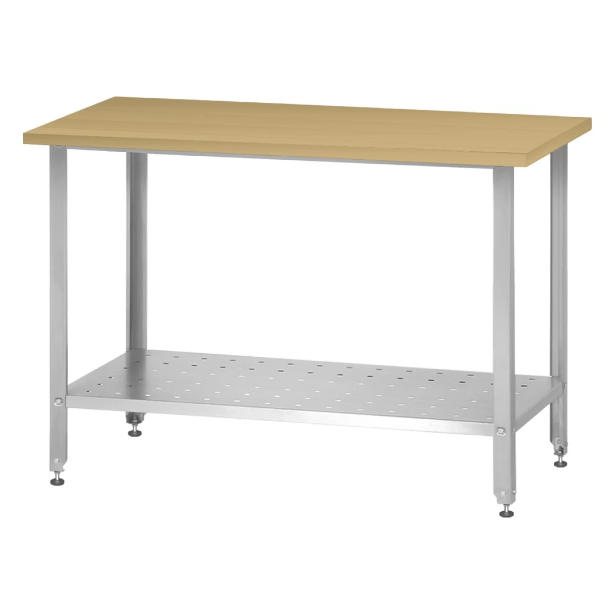- Устойчивость каркаса возрастает за счёт установки под столешницу усиленной полки с перфорацией, играющей роль стяжки для ножек.